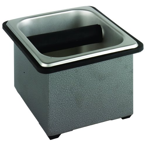This knock box is made from heavy duty stainless steel featuring a welded metal bar for durability. It has a replaceable rubber bar cover and an edge gasket made of molded rubber. This knock box is designed for commercial use. The attractive, powder coated stainless steel holder adds stability to your knock box while giving your counter a completed look. The holder has an open bottom with non-scratch rubber feet to avoid slipping. Knock box measures 6" x 5.5" x 4". Replacement rubber bar covers are sold separately.